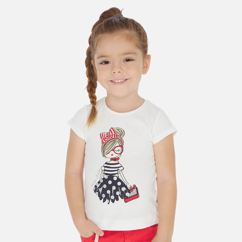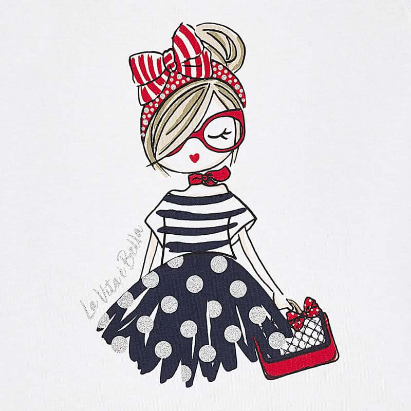 Футболка Mayoral 3004-10 комплект 2 шт для девочки. Футболки классического дизайна, приталенные. Белая футболка украшена принтом (фотопечать) — девушка с сумочкой. Синяя футболка в — полоску, декорирована стразами. Цвет marino (белый, синий).